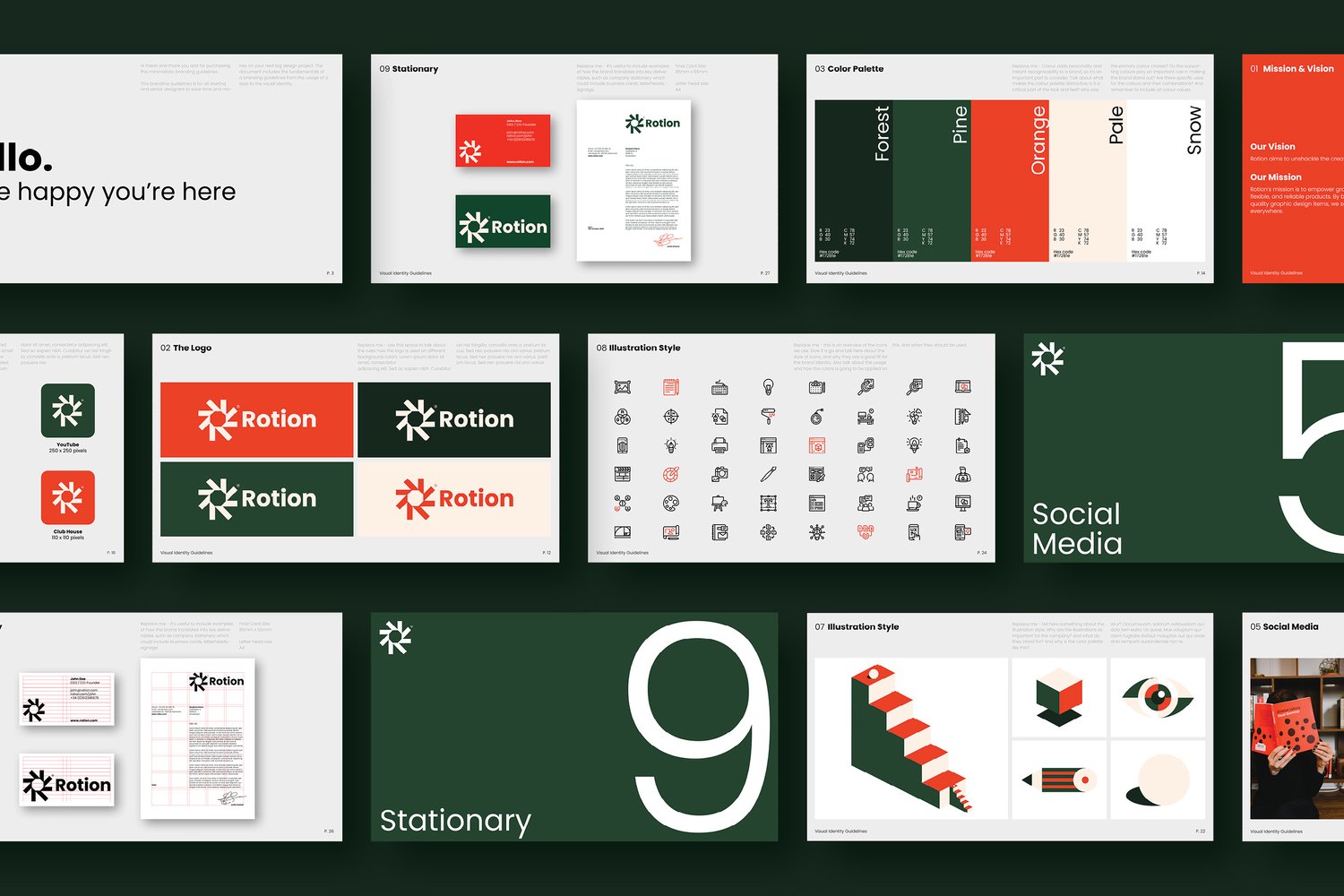 The Branding Guidelines set is a series of 27 creative and fully customizable layout design templates for Figma in the format 1920x1080 (digital). With these branding guidelines you can provide your client a completely clear overview of how they should handle their logo and corporate identity elements.