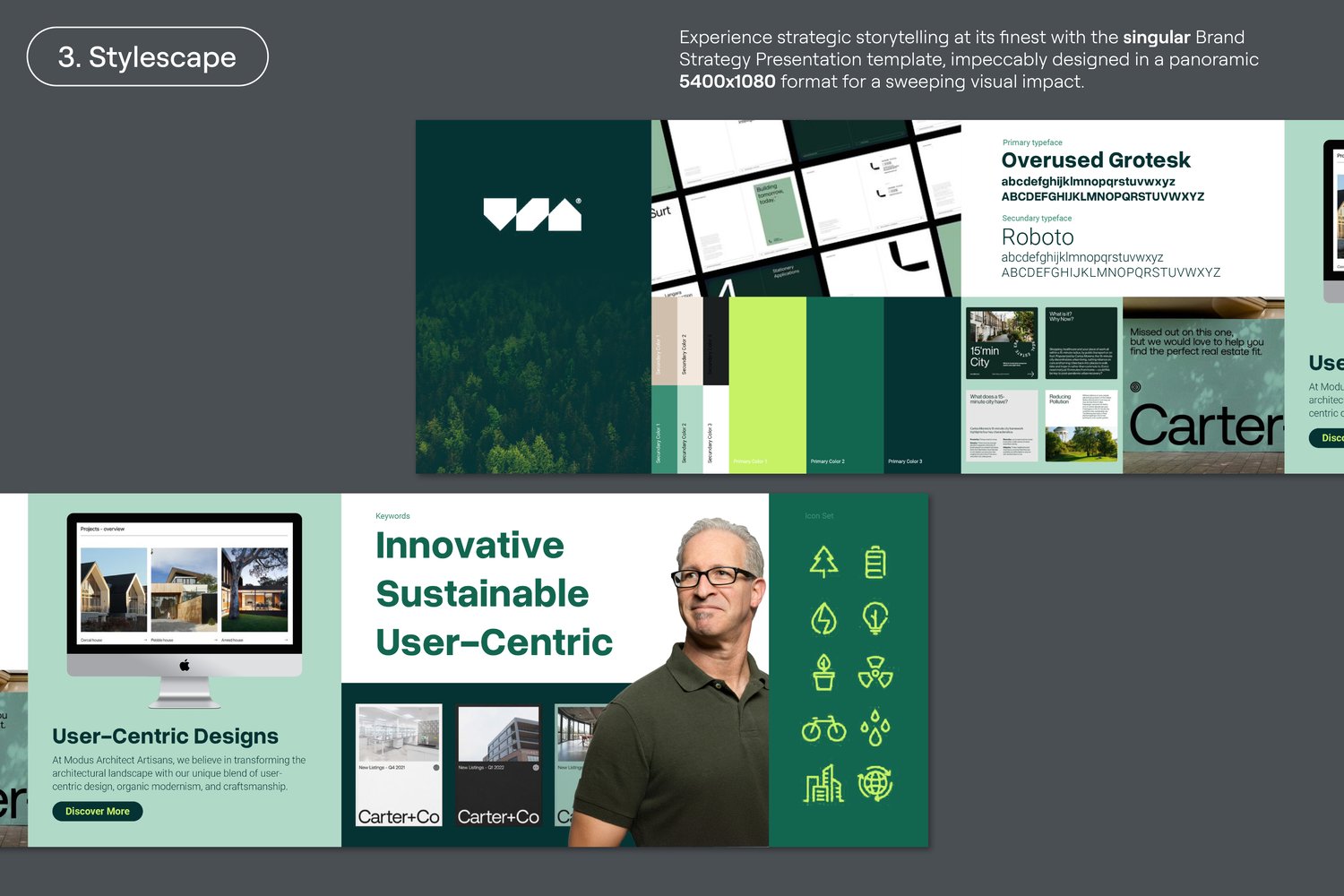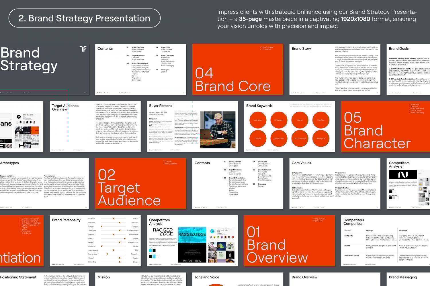 A fully designed presentation deck that helps you turn all your insights into a clear, professional story. Use it to present audience personas, positioning, mission, brand story, tone of voice, keywords, and messaging.