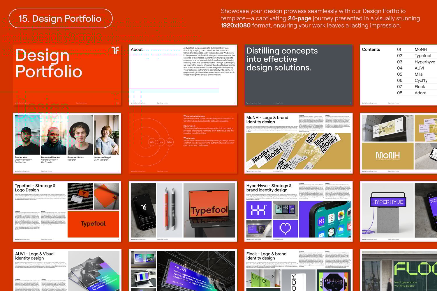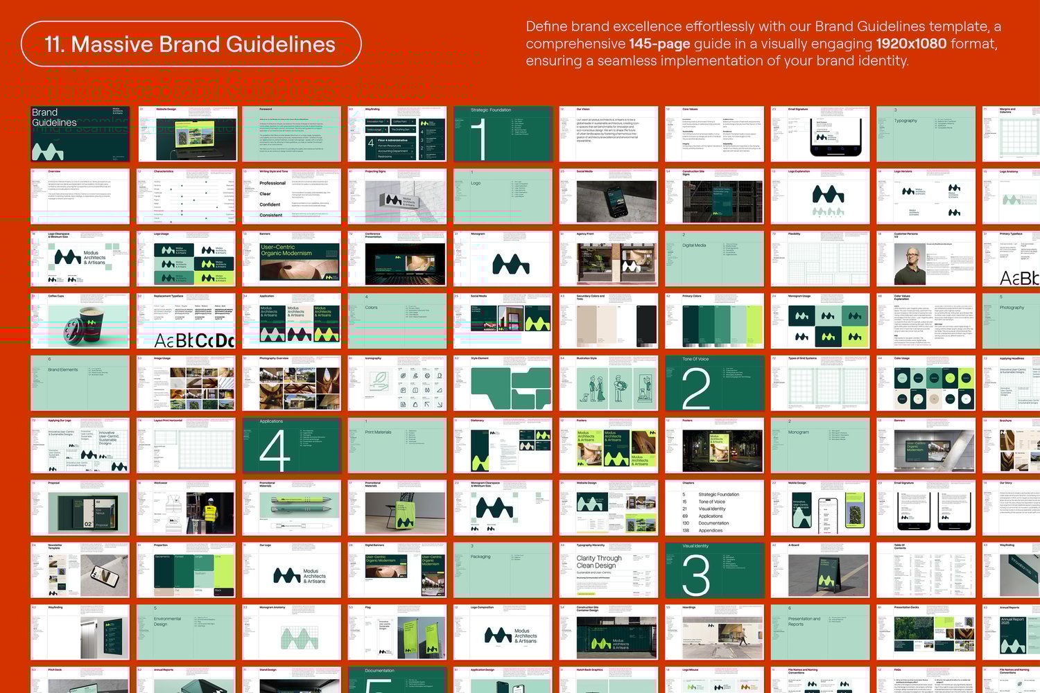 This bundle offers 15 fully customizable templates designed for every step of a brand identity project.
